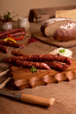 Es wird fast ausschließlich im eigenen Revier erlegte Wildbret für die Herstellung unserer beliebten Wildknacker verwendet, mit edelsten Naturgewürzen verfeinert und über feinstem Buchenrauch veredelt. Enthält ca 30% Schweinefleisch aus eigener Schlachtung vom Vertrags-Landwirt nebenan.