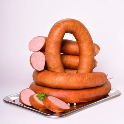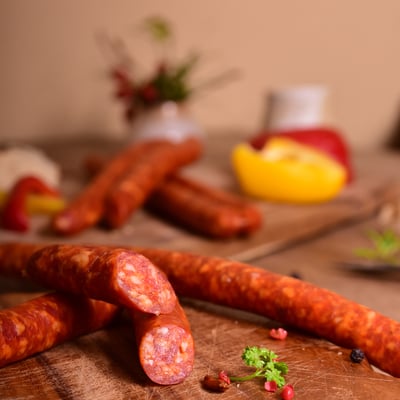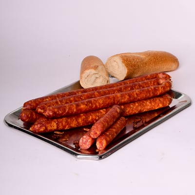 nach Art Rohpolnische Knacker, mit kräftiger Chillyschärfe die aber nicht brennt. über reinstem Buchenrauch veredelt.