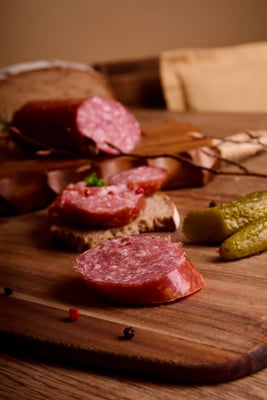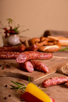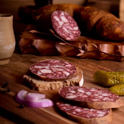 unsere selbstgemachte und Lieblingssorte, wahlweise mit oder ohne ganzen Pfefferkörnern, kleine Portionswürstchen oder ganze Stangen.