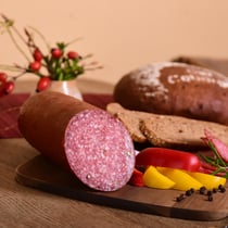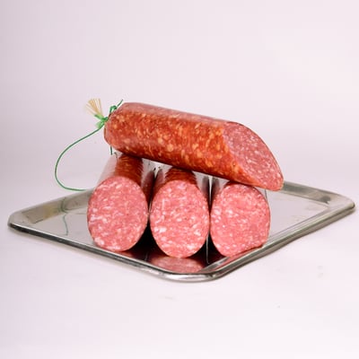 hergestellt aus reinstem Magerfleisch aus Schulter, Keule und Bauch, mit unserer eigenen Gewürzmischung, die nur aus feinsten Rohgewürze besteht, vefeinert und mit reinstem Buchenrauch veredelt.