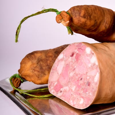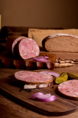 aus schlachtwarmen Fleisch hergestellt, nach Art fränkischer Weißgelegter, wie zu Großvater's Zeiten traditionell hergestellt, mit reinen Rohgewürzen und frischen Zwiebeln.