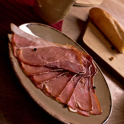 von ausgewählten Tieren unserer Vertragslandwirte, mit unserer eigenen Gewürzmischung und Meersalz trockengesalzen und über reinstem Buchenrauch veredelt!